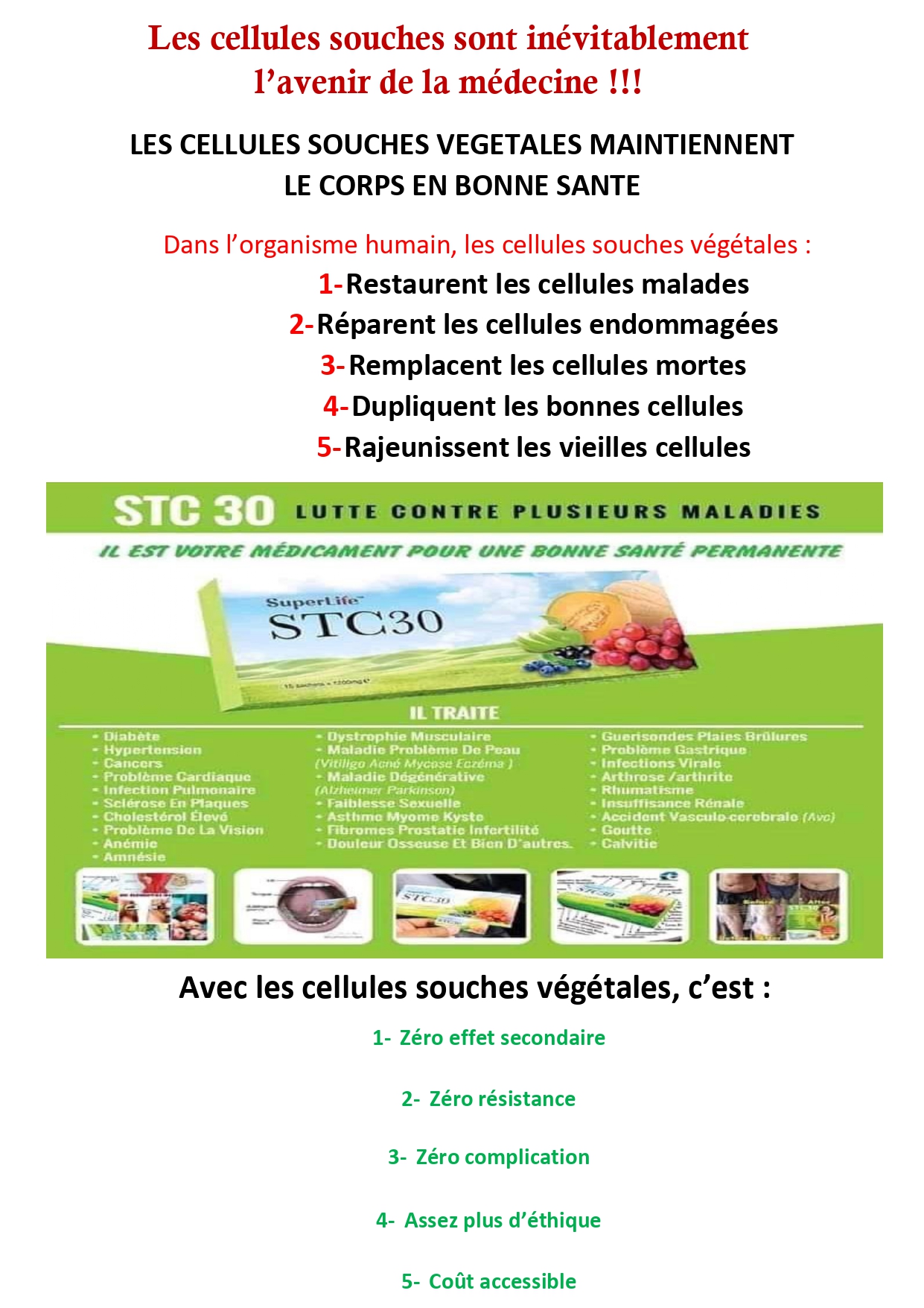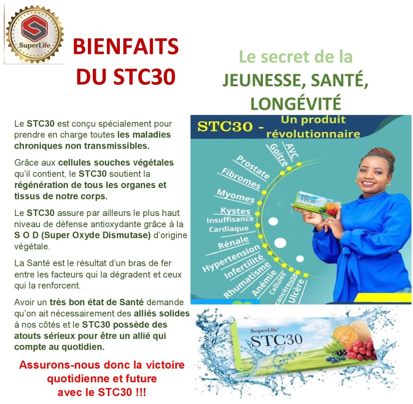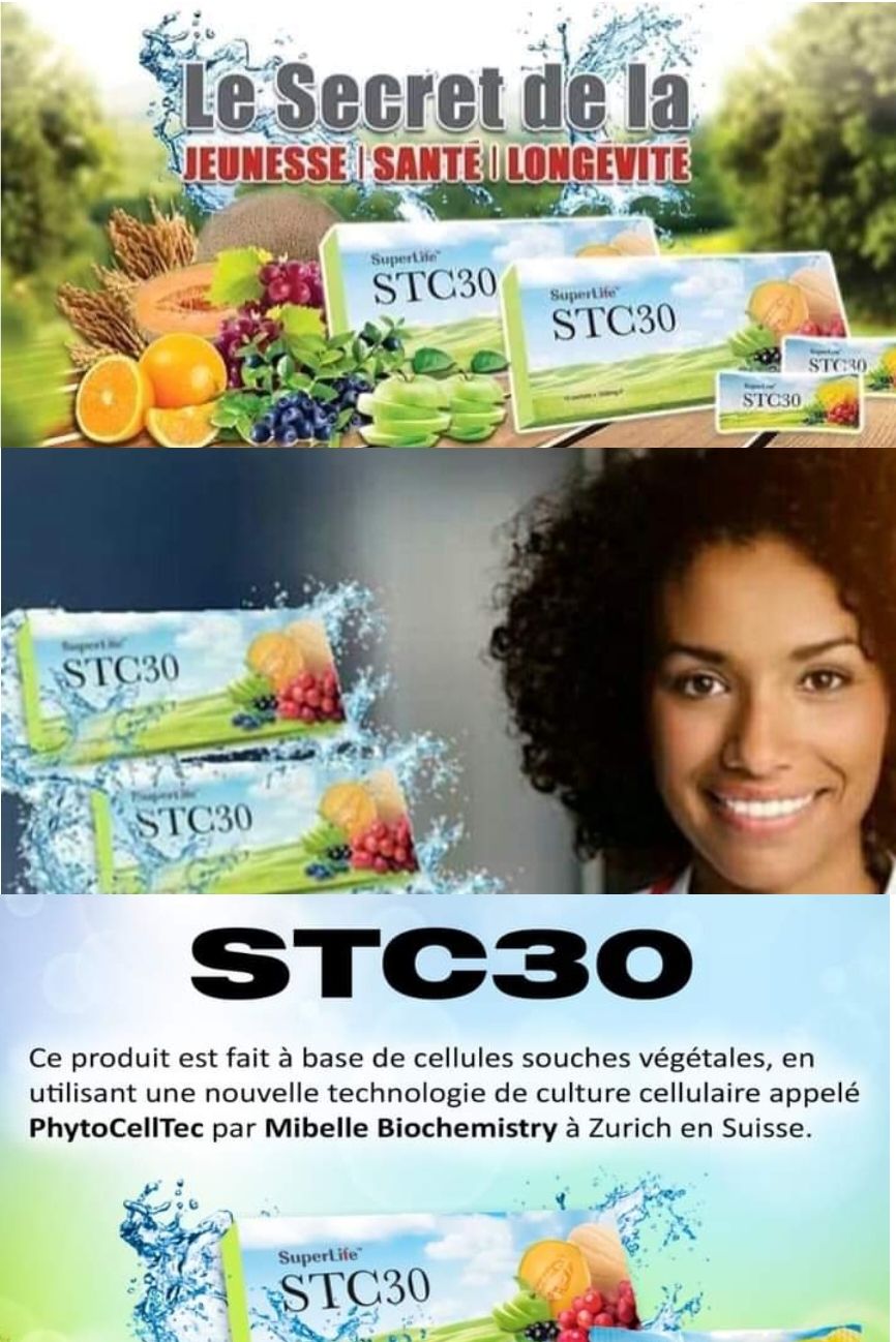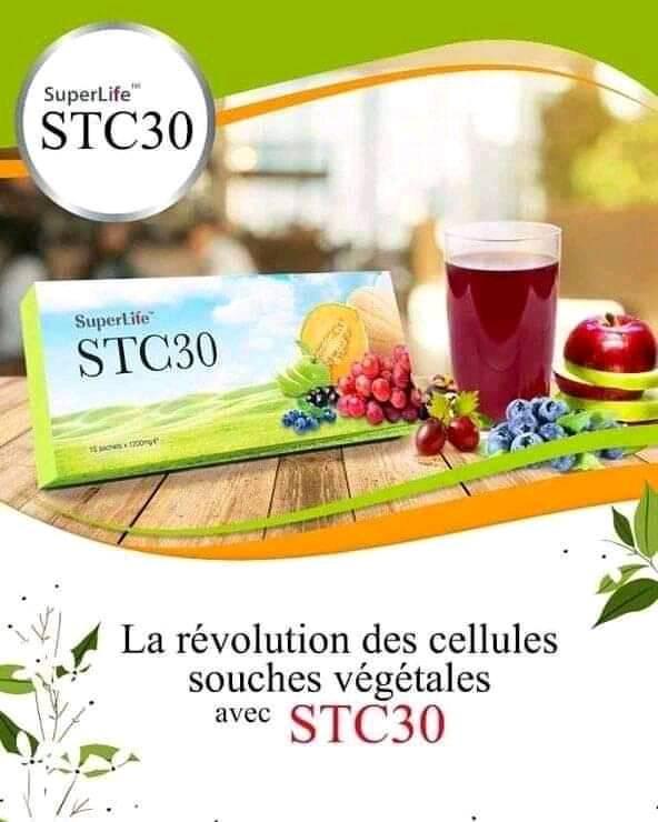 Reponse : Le STC30 est composé d'éléments régénérateurs tels que les cellules souches du super pommier suisse, des cellules souches du raisin, du bilberry, du blackcurrant, de la vitamine C et de l'antioxydant S O D (1Million de fois plus puissant que les autres)