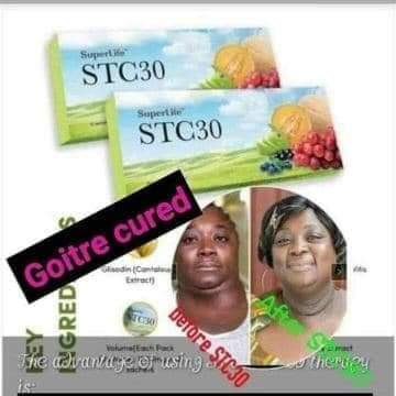 Waaaooouuuhhh!!! Je suis si contente de dire Merci à DIEU qui a inspiré aux hommes la création du STC30 qui m'a permis de recouvrer la totale guérison du goitre dont je souffrais depuis 5ans environs. Je n'y croyais pas au début mais là maintenant, je le recommande vivement à tous ceux qui constatent une anomalie ou un dysfonctionnement dans leur corps.